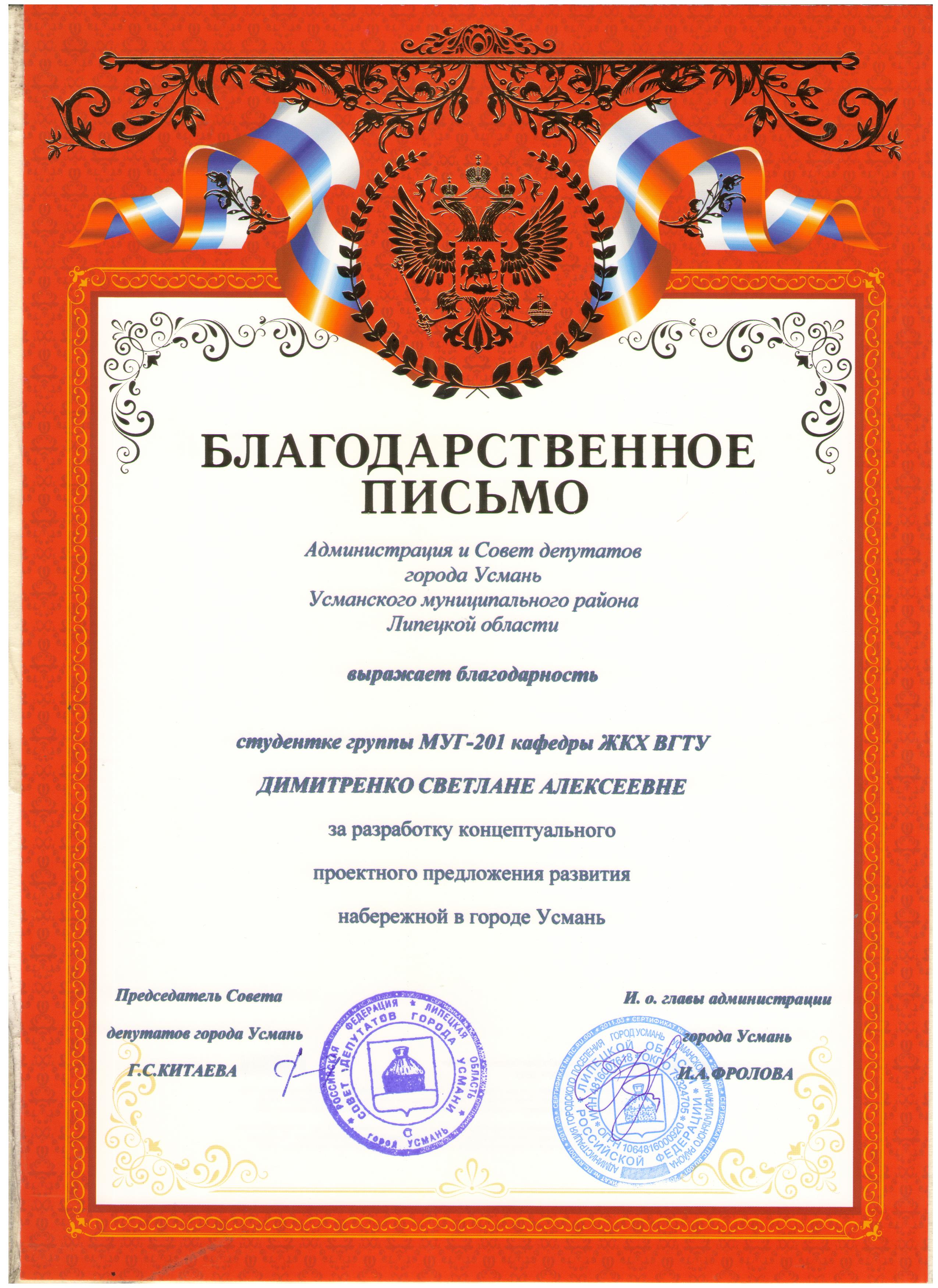Благодарственное письмо Администрации и Совета депутатов г. Усмань Липецкой области студ. гр. мУГ-201 Димитренко С.А. за разработку концептуального проектного предложения развития набережной в г. Усмань.