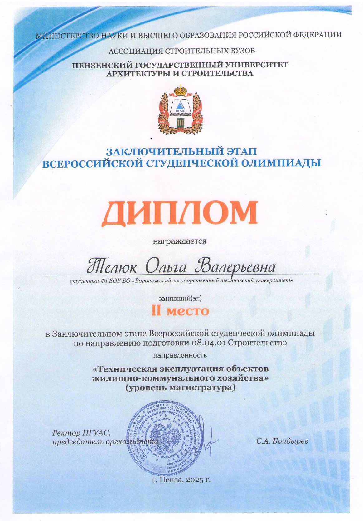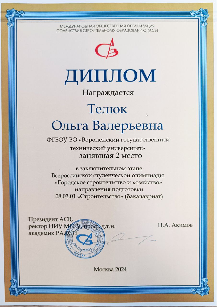 Диплом II место Телюк О.В. в заключительном этапе Всероссийской студенческой Олимпиады по направлению подготовки 08.04.01 "Строительство" направленность "Техническая эксплуатация объектов ЖКХ" (уровень магистратура) Пенза 2025