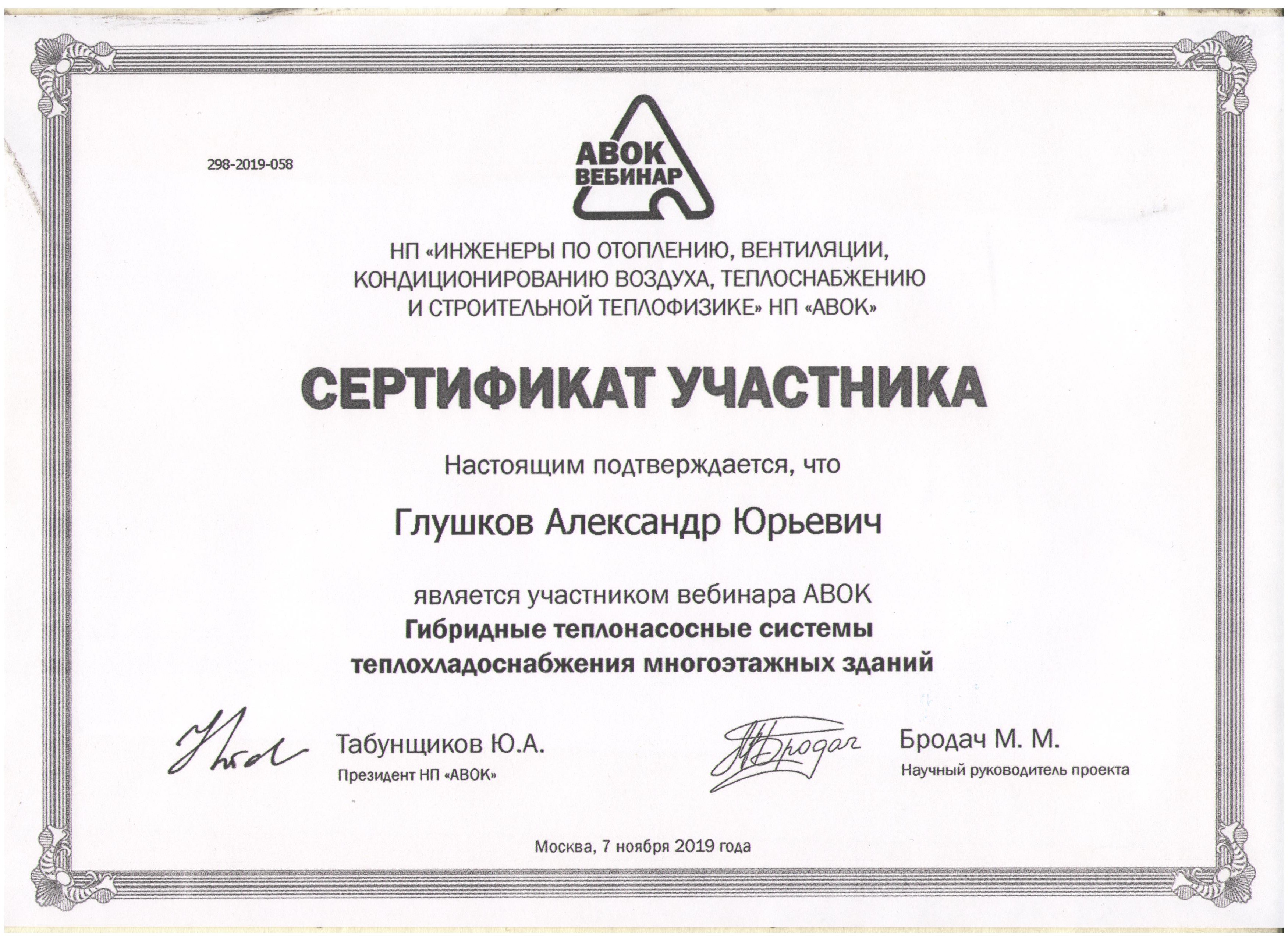 Сертификат участника 1, 2, 3, 4 вебинаров АВОК Глушков А.Ю.