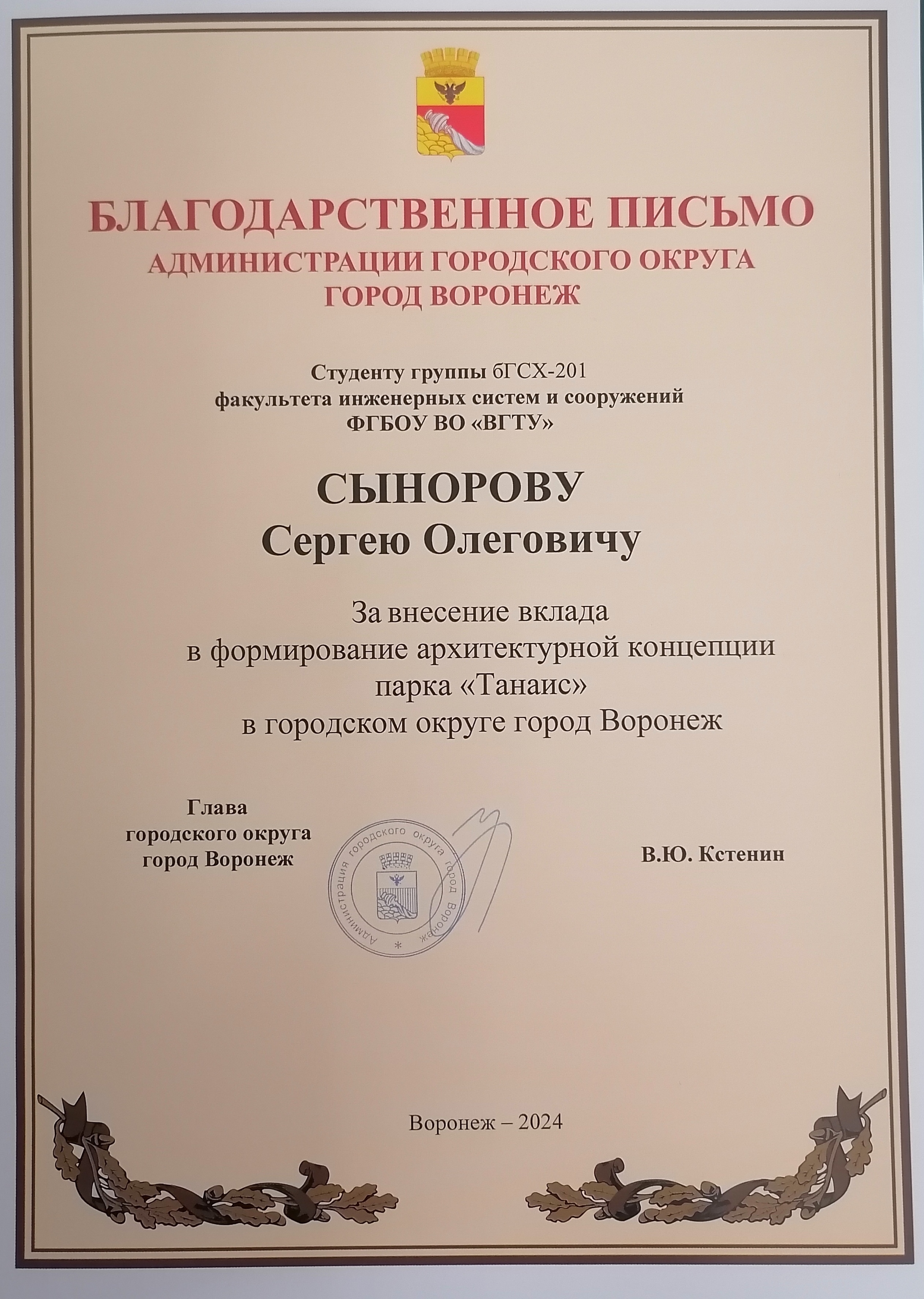 Благодарственное письмо за внесение вклада в формирование архитектурной концепции парка "Танаис" в городском округе г. Воронеж Чернавскому Э.И., Сынорову С.О.