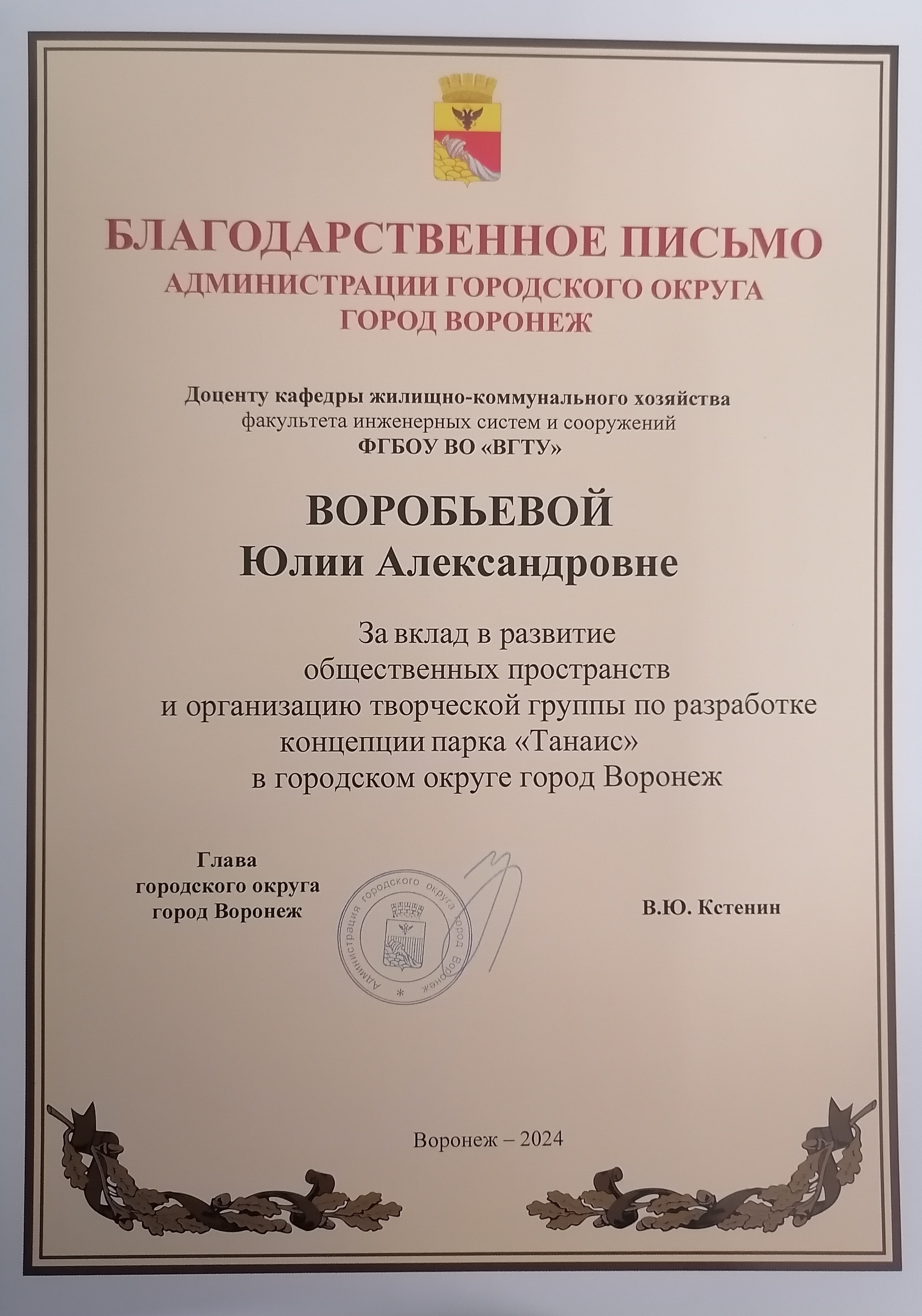 Благодарственное письмо за вклад в развитие общественных пространств и организацию творческой группы по разработке концепции парка "Танаис" в городском округе г. Воронеж доц. Воробьевой Ю.А.