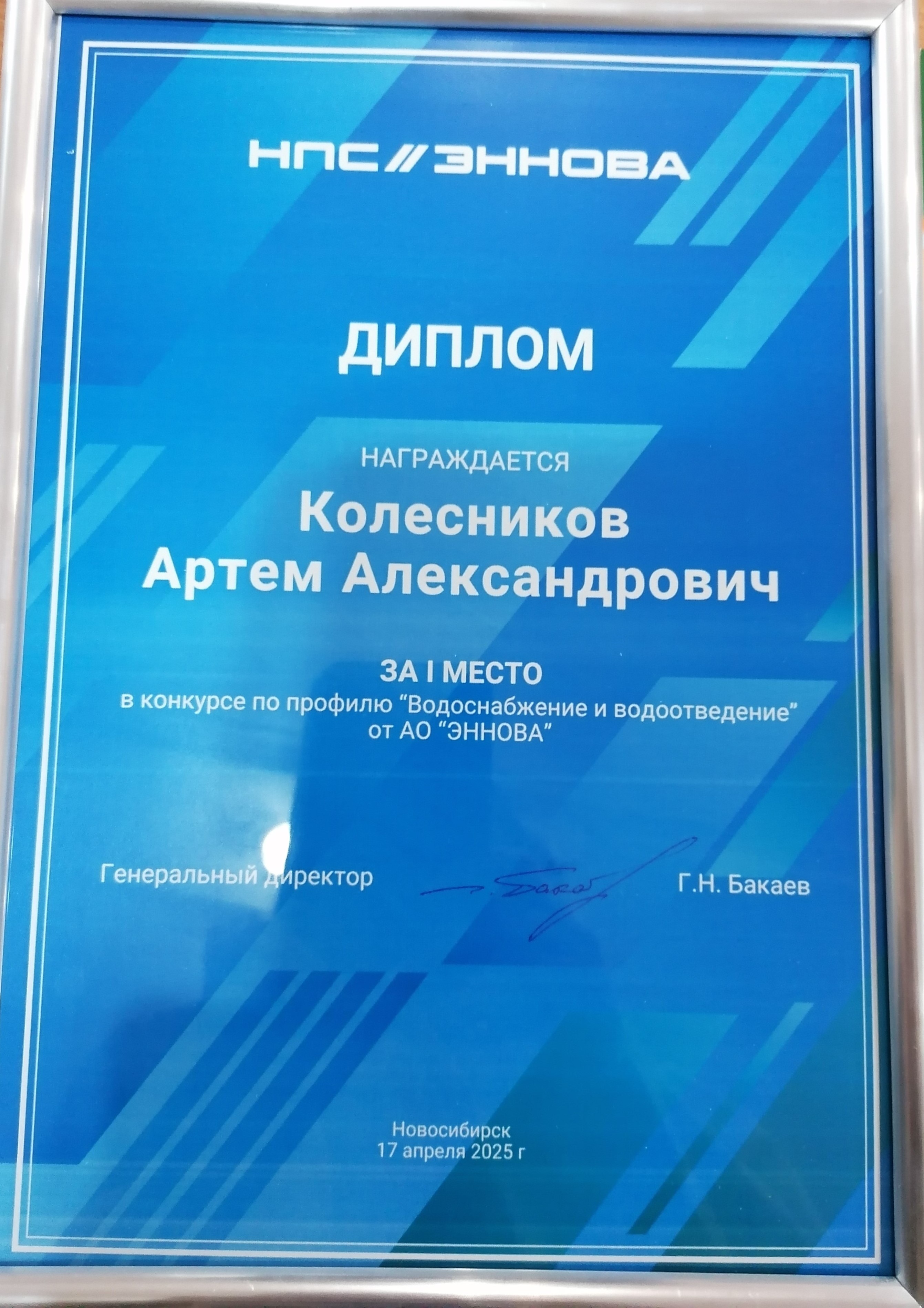 Диплом за I место в конкурсе по профилю "Водоснабжение и водоотведение" от АО "ЭННОВА" награждается Колесников А.А. Новосибирск 2025