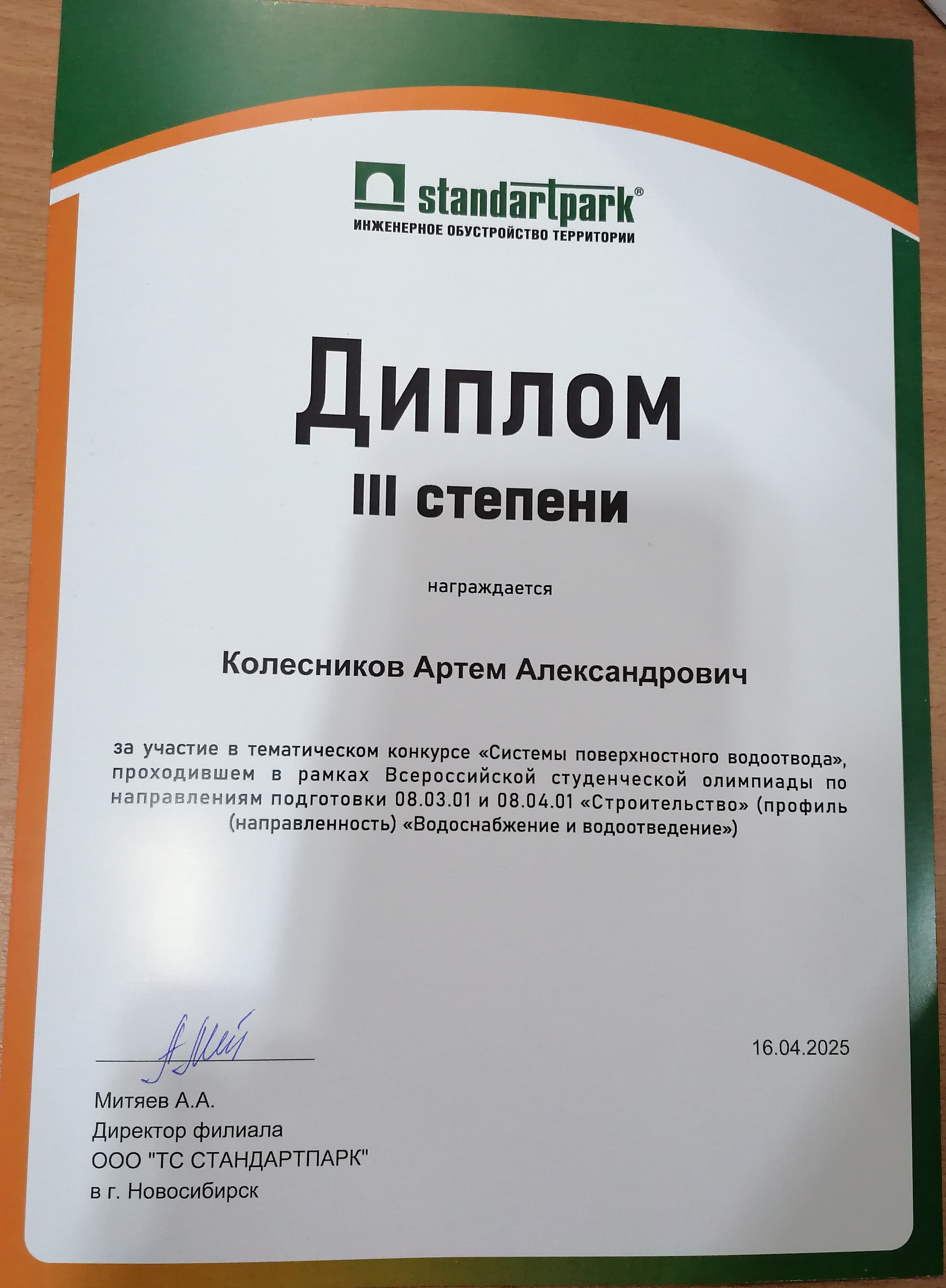 Диплом III степени за участие в тематическом конкурсе "Системы поверхностного водоотвода" награждается Колесников А.А. студенческой Олимпиады по профилю "Водоснабжение и водоотведение" 2025