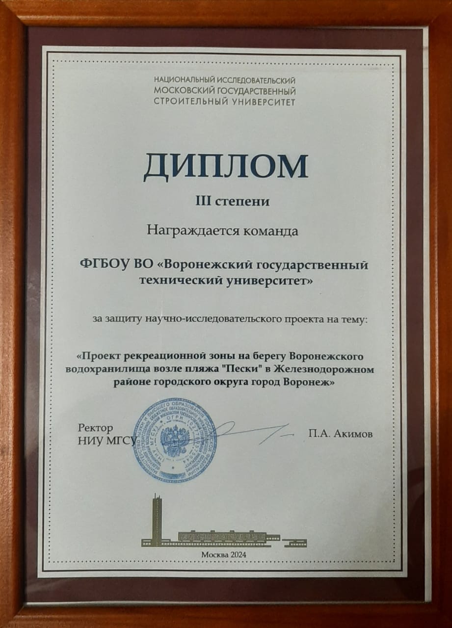 Диплом III степени награждается команда ВГТУ за защиту научно-исследовательского проекта на тему: "Проект рекреационной зоны на берегу Воронежского водохранилища возле пляжа "Пески" в ЖД р-не городского округа г. Воронеж".