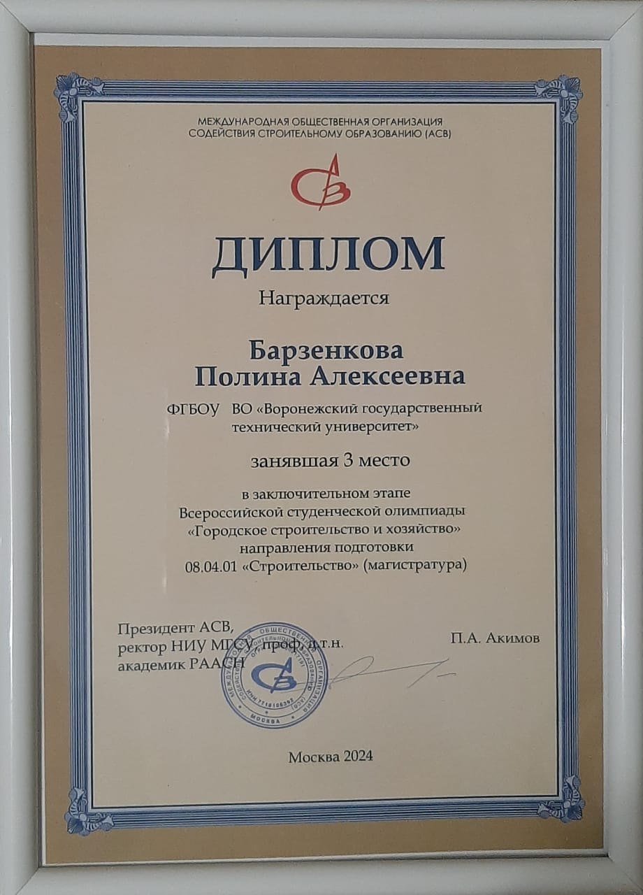 Диплом III место награждается Барзенкова П.А. в заключительном этапе Всероссийской студенческой олимпиады "ГСХ" направления подготовки 08.04.01 "Строительство".