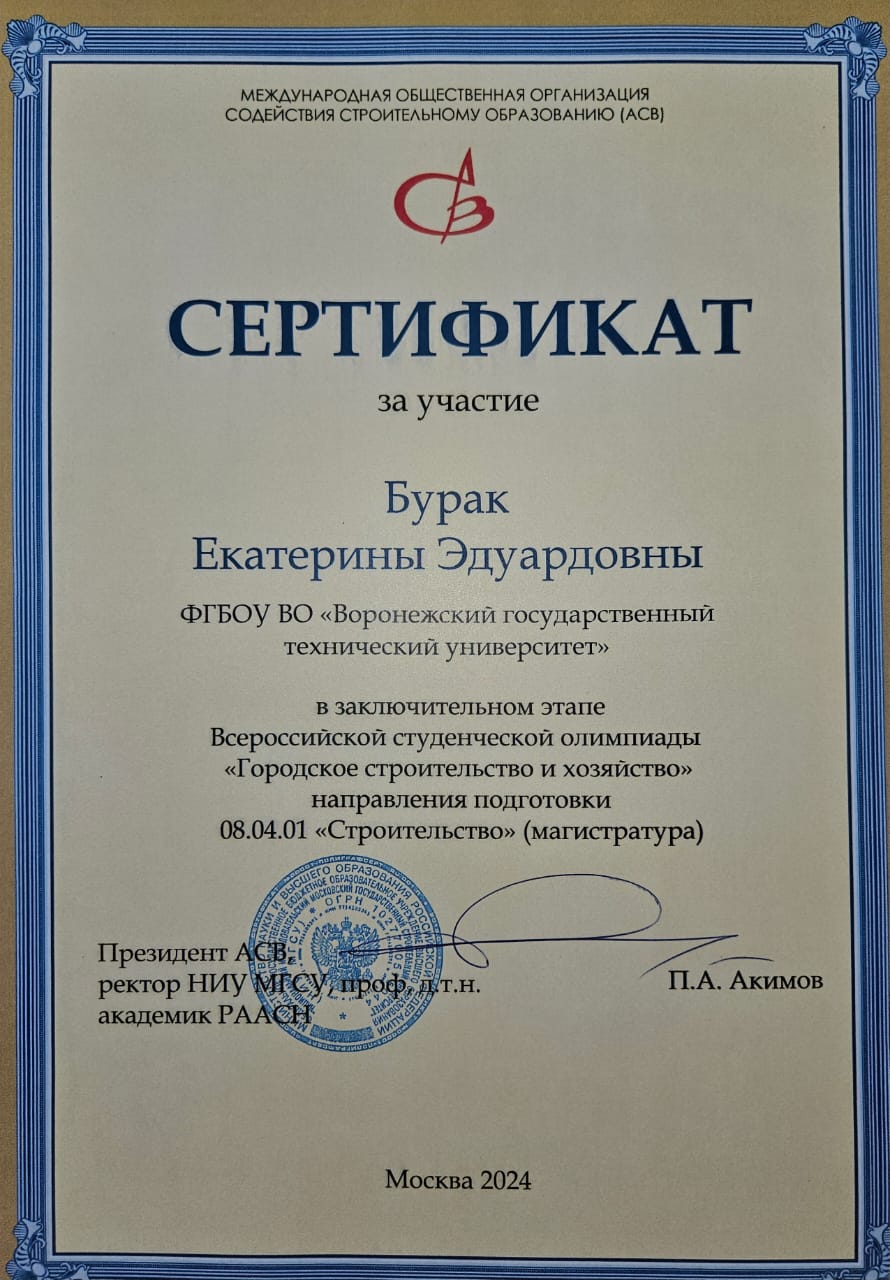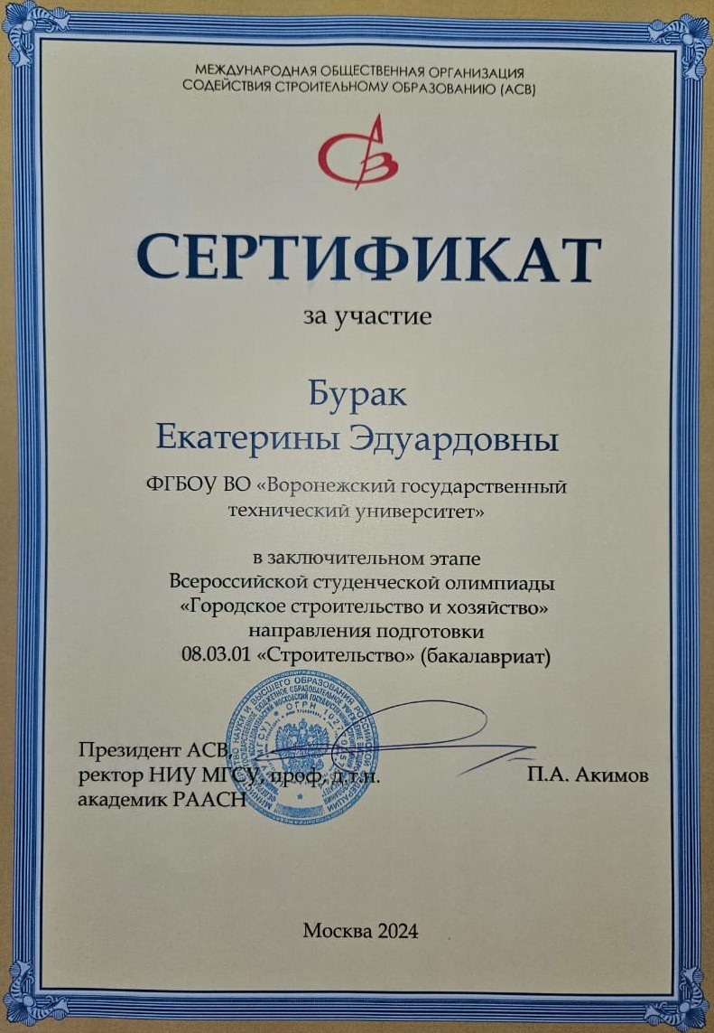Сертификат за участие к.т.н., доценту Бурак Е.Э. в заключительном этапе Всероссийской студенческой олимпиады "ГСХ" направления подготовки 08.03.01 "Строительство" (бакалавриат), 08.04.01 "Строительство" (магистратура).