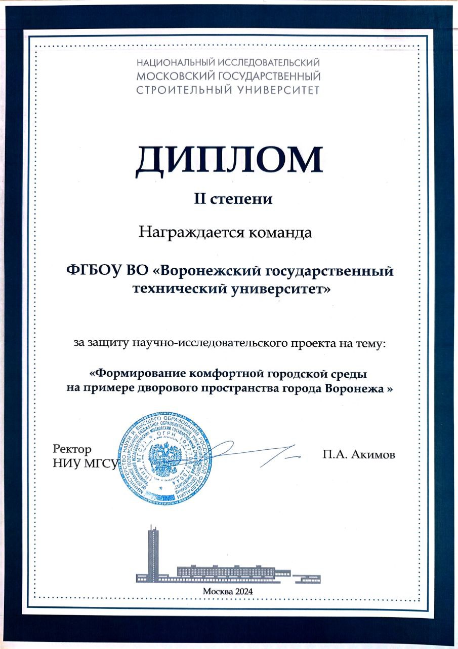 Диплом за II степени награждается команда ВГТУ за защиту научно-исследовательского проекта на тему: "Формирование комфортной городской среды на примере дворового пространства г. Воронежа".