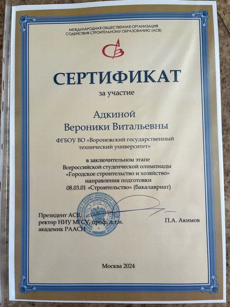Сертификат за участие Адкиной В.В. в заключительном этапе Всероссийской студенческой олимпиады "ГСХ" направления подготовки 08.03.01 "Строительство".