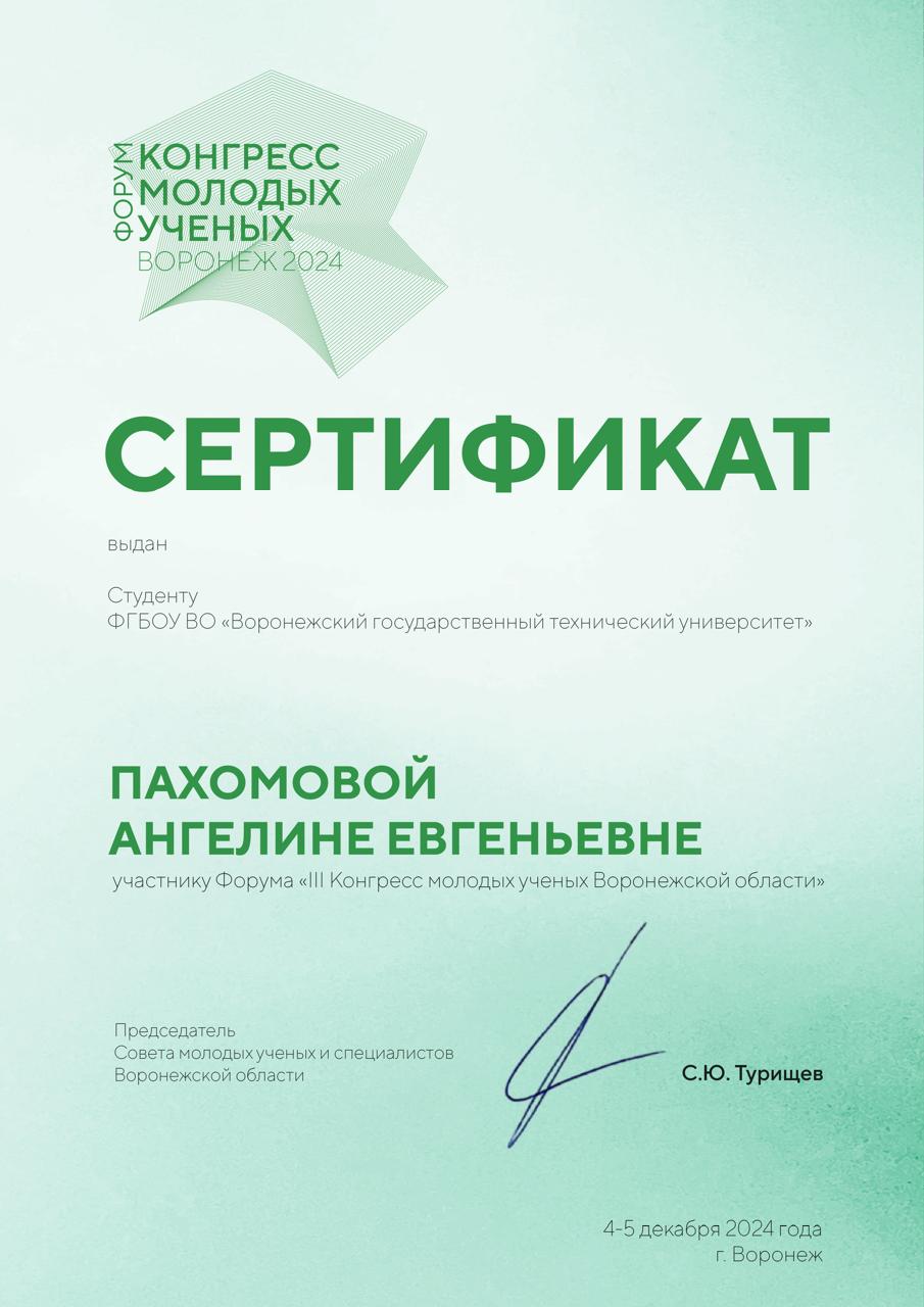 Сертификаты участников форума "III Конгресс молодых ученых Воронежской области" Пахомова А.Е. и Федосов Д.Д.