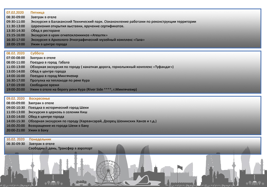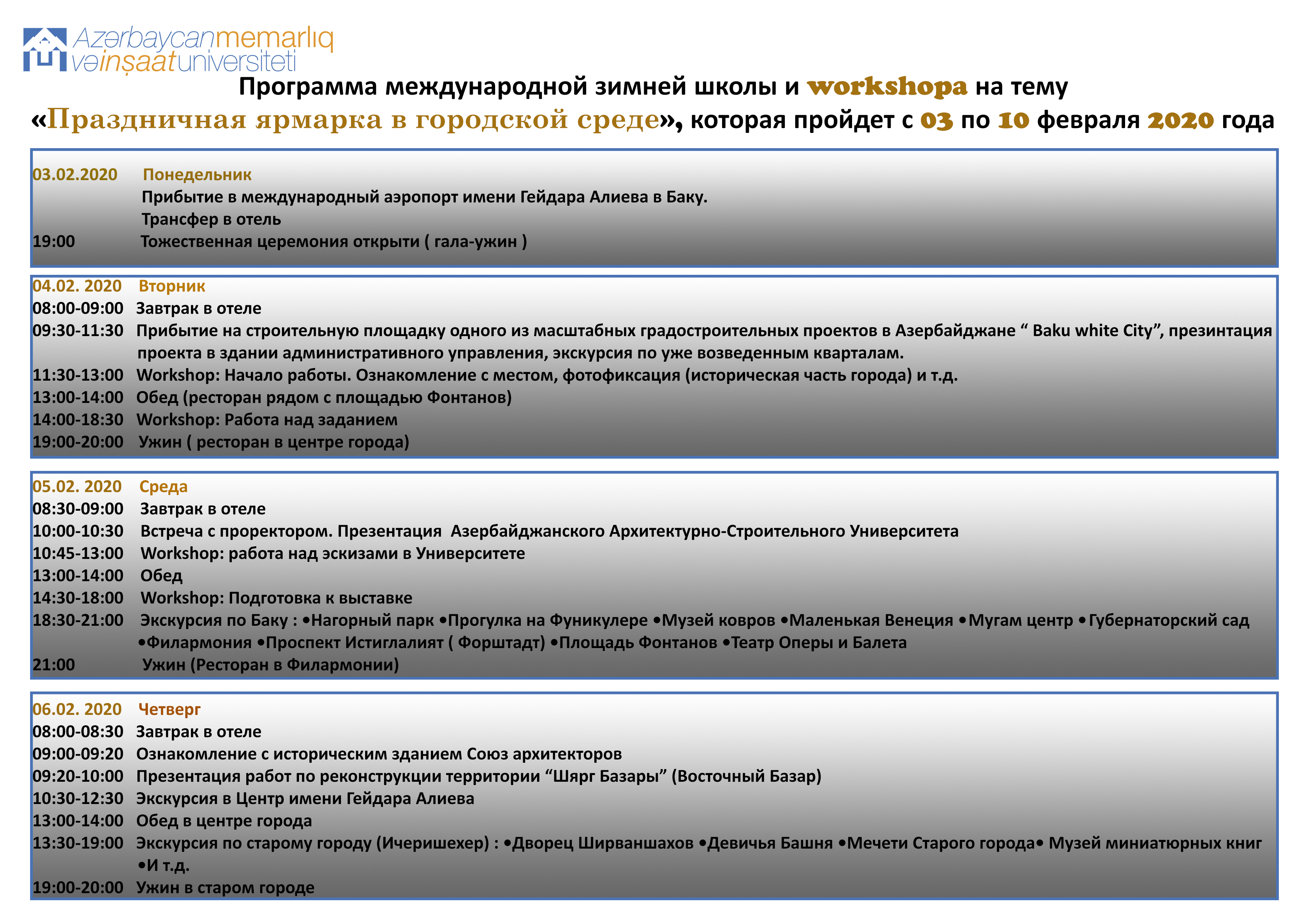 Накануне Воркшопа студенты смогут познакомиться с историческими архитектурными жемчужинами Баку, а также очаровательными красотами четырех разных регионов нашей страны и принять участие в культурных программах.