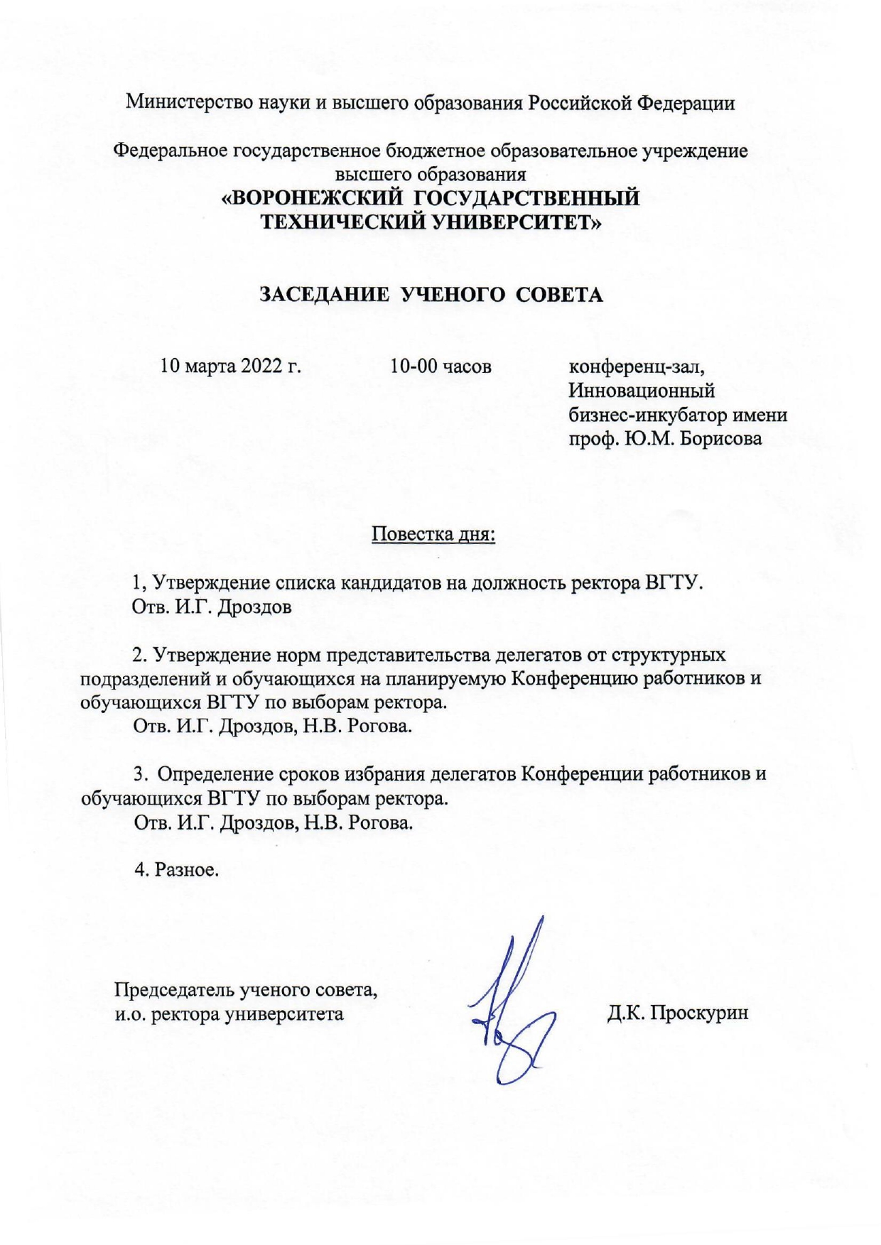 10 марта 2022 года состоится заседание Ученого совета ВГТУ
