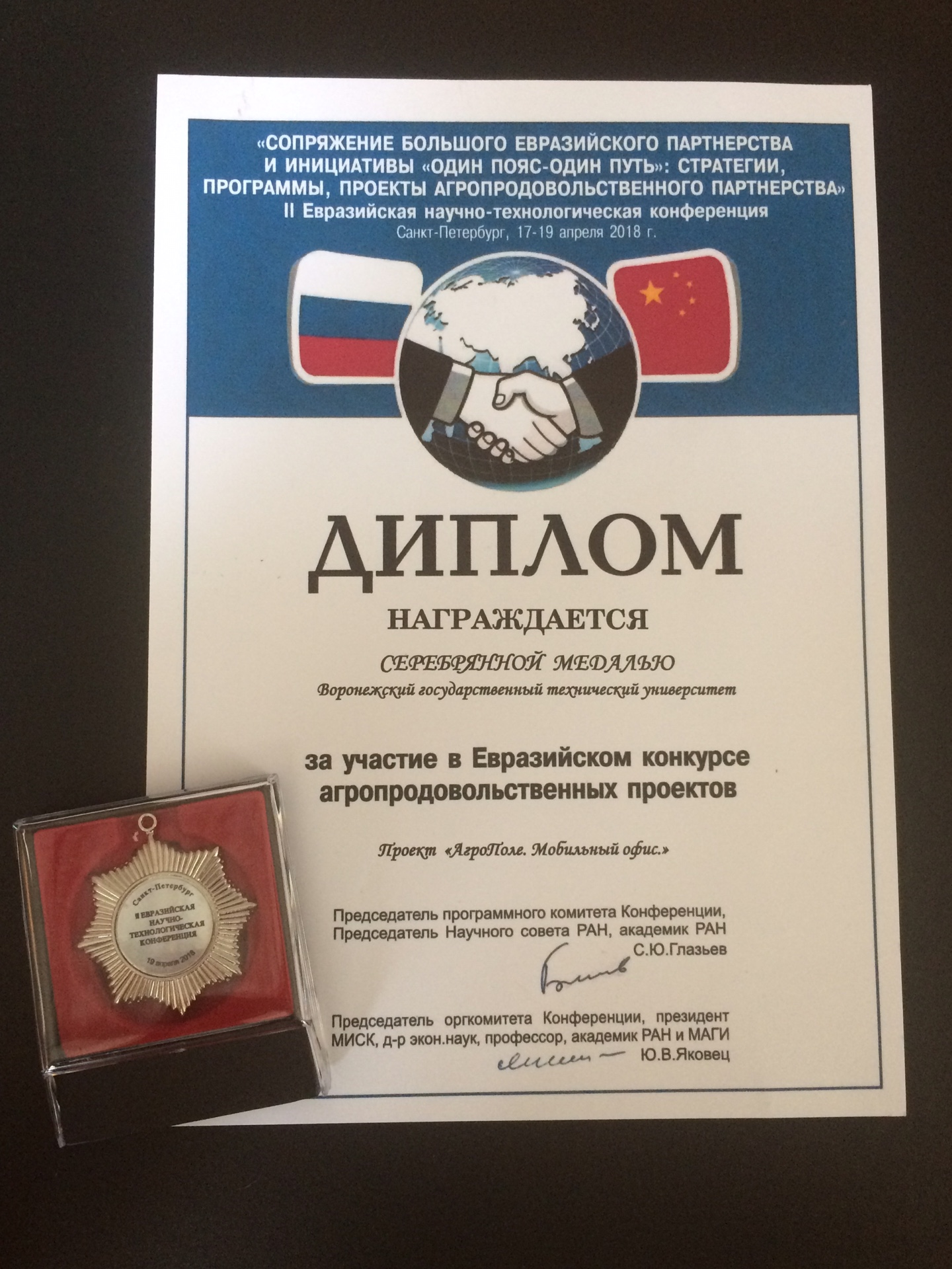 По итогам конференции за участие в Евразийском конкурсе агропродовольственных проектов Воронежский государственный технический университет был награжден серебряной медалью.
