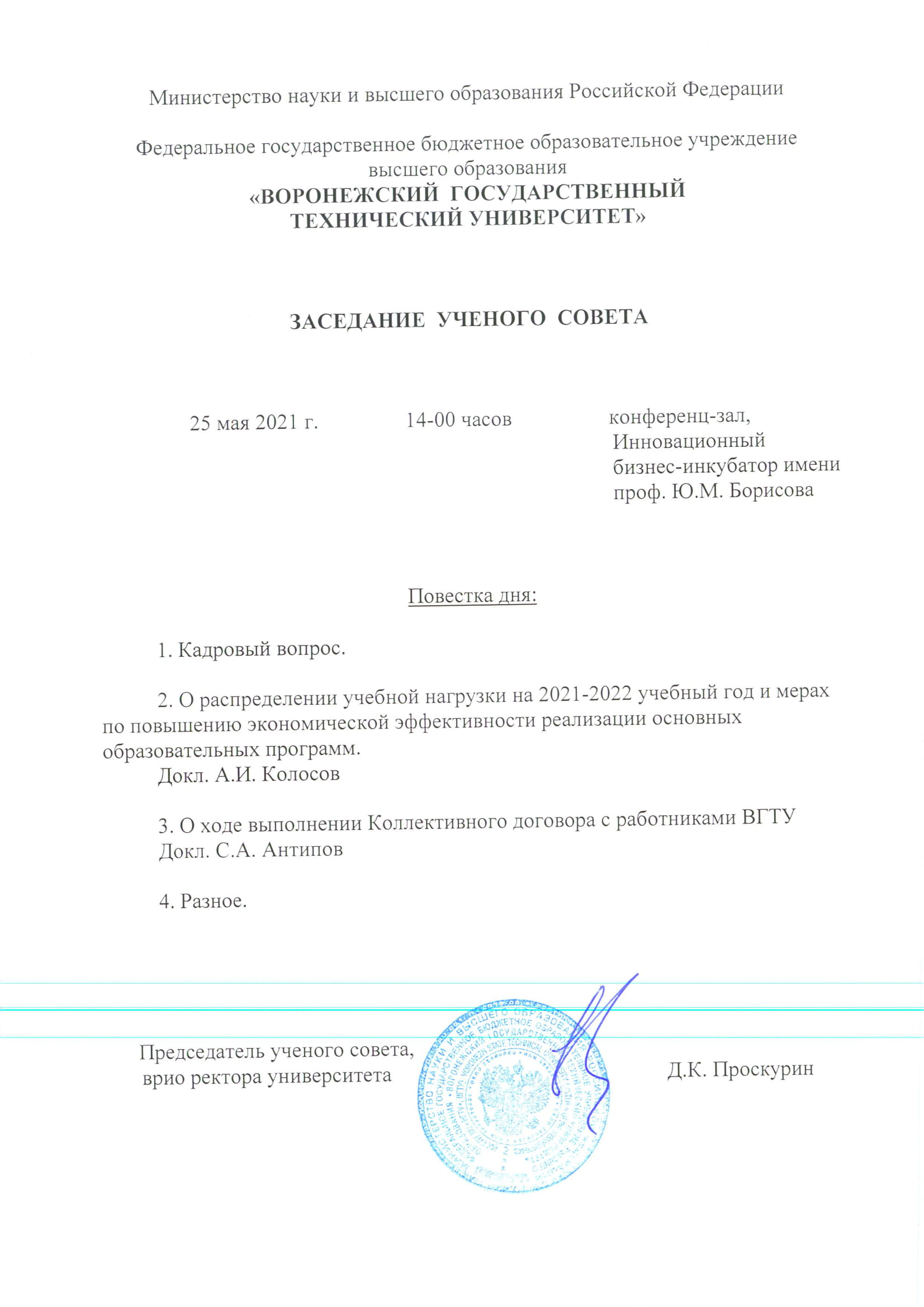 25 мая 2021 года состоится заседание Ученого совета ВГТУ