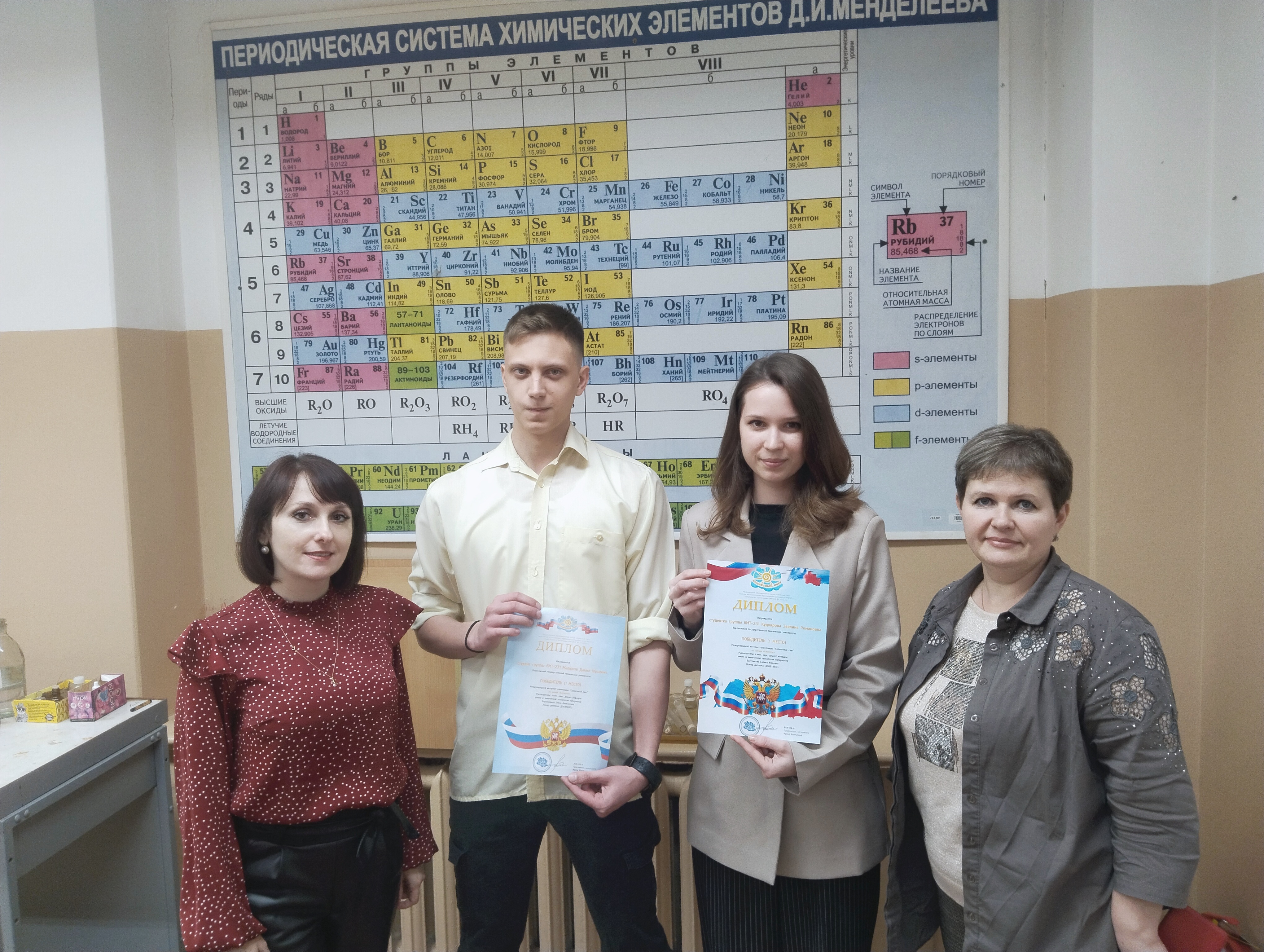 11 апреля 2025 в г. Москва прошла Международная интернет-олимпиада по химии по теме: «Кислоты». От кафедры химии и химической технологии материалов участвовали студенты группы бМТ-231 Кудоярова Э.Р. и Малюков Д.Ю. под руководством доцентов кафедры Хорохординой Е.А. и Востриковой Г.Ю. было выиграно 1 место. Кафедра поздравляет студентов и коллег с победой!