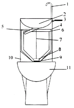 Полезная модель относится к санитарно-техническому оборудованию, в частности к оборудованию, использующему отработанную воду, и может найти применение в туалетных комнатах предприятий общественного питания, жилых, производственных и служебных помещений. Санузел, содержащий унитаз и смывной бачок с умывальником, характеризующийся тем, что смывной бачок внутри содержит два элемента, внутренний и внешний, каждый из которых состоит из эллиптического цилиндра с основанием в виде конуса эллиптического сечения, при этом верхняя часть внутреннего элемента бачка выполнена ниже верхней части внешнего элемента бачка, диаметр внутреннего элемента бачка меньше диаметра внешнего элемента бачка, с образованием зазора между внутренним и внешним элементами бачка, внутренний элемент бачка выполнен с возможностью наполнения его отработанной водой из установленной на смывном бачке умывальника и последующего смыва отходов жизнедеятельности человека через сливную пробку, а внешний - предназначен для защиты унитаза от перелива и напрямую соединен с унитазом для вывода отработанной воды.