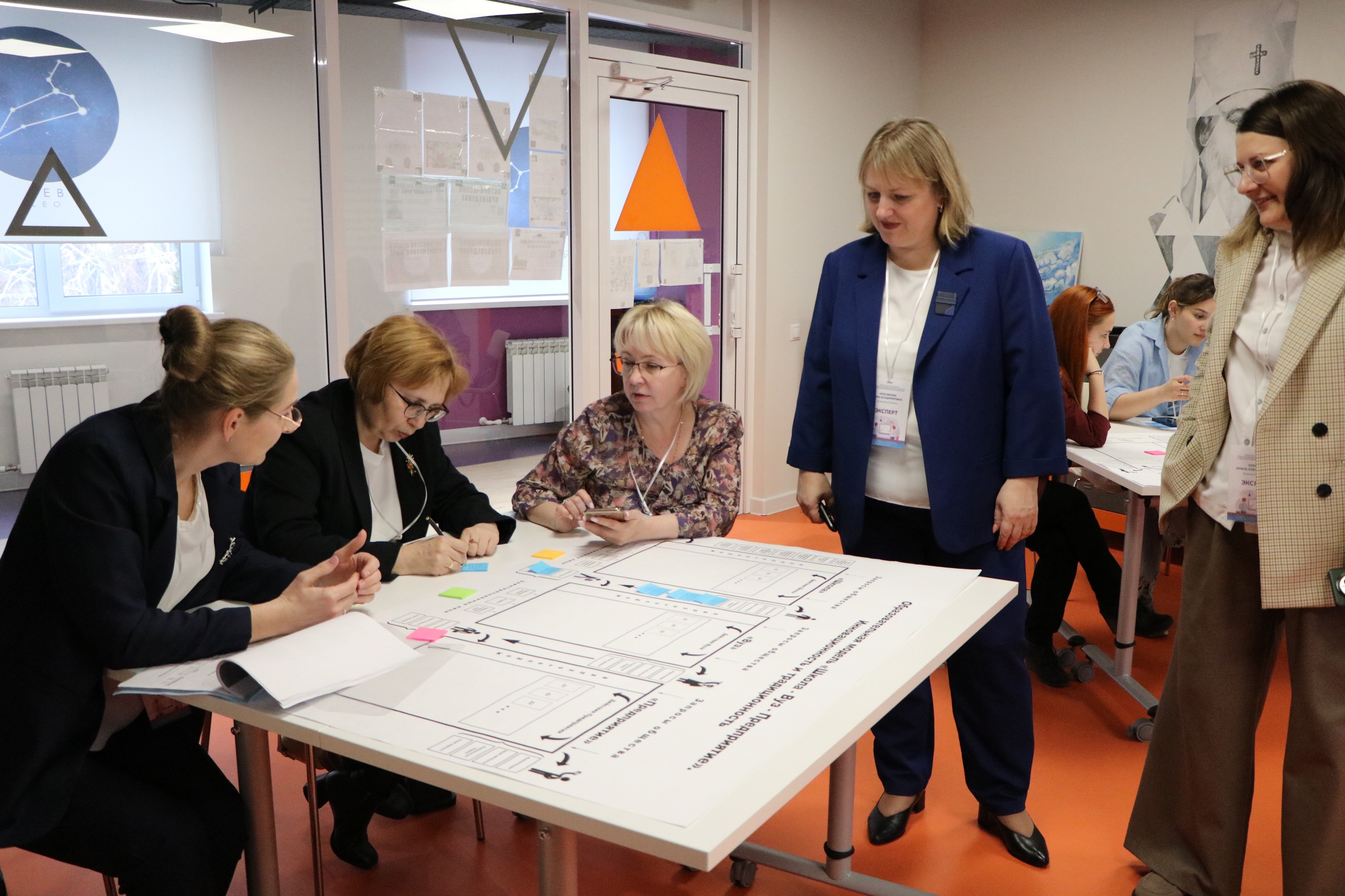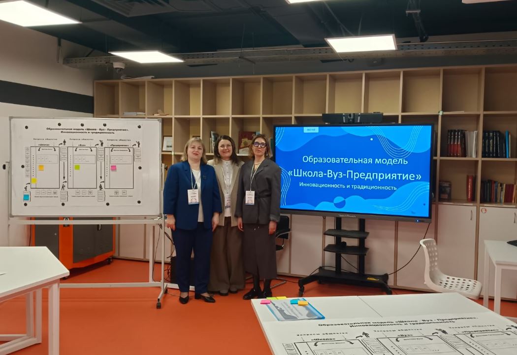 На площадке «Школа-Вуз-Образование» участникам конференции было предложено сформировать образовательную модель, в основе которой лежит построение долгосрочного образовательного маршрута от школьника до работника предприятия с учетом сочетания инновационных подходов и традиционных методов обучения. А.В. Красникова, Т.С. Наролина и И.А Пургаева помогали участникам сформировать образ выпускника школы, вуза и работника предприятия, с учетом этого описать перечень действий школы, вуза и предприятия, которые бы позволили достичь тот образ, который был изначально определен.
