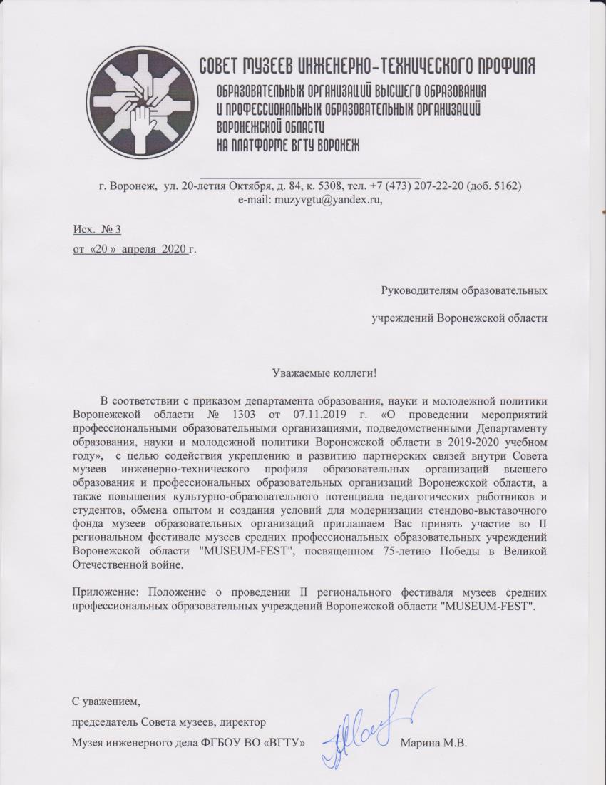 В этом году вновь состоится фестиваль музеев образовательных учреждений Воронежской области "MUSEUM-FEST". Организатором фестиваля стал Совет музеев инженерно-технического профиля, созданный на площадке ВГТУ, который объединяет более 30 образовательных учреждений высшего, среднего и профессионального образования. Совет существует при поддержке департамента образования, науки и молодежной политики Воронежской области, а также «Регионального центра выявления, поддержки и развития способностей и талантов у детей и молодежи» и Лискинского историко-краеведческого музея.