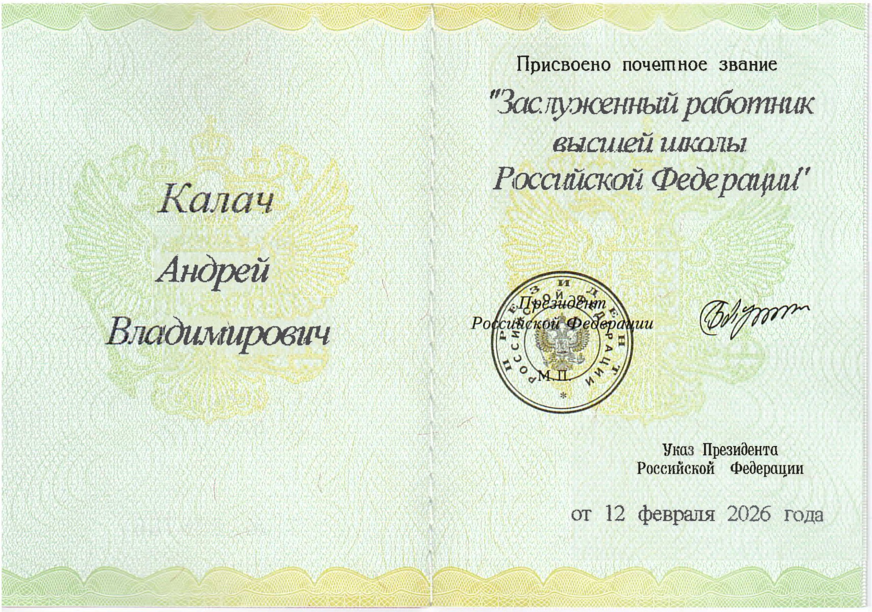 В преддверии Дня защитника Отечества д.т.н., профессор кафедры жилищно-коммунального хозяйства Калач Андрей Владимирович удостоен почетного звания «Заслуженный работник высшей школы Российской Федерации». Соответствующий указ подписал Президент Российской Федерации Владимир Путин.